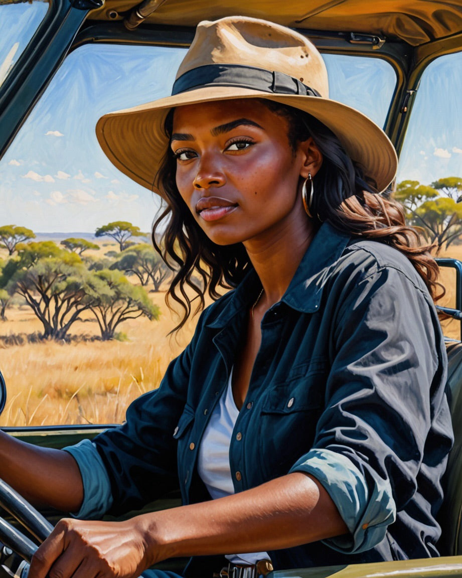 Radiating adventure, sophistication and warmth, Beauty in Safari embodies the art of refined beauty. The golden tones dance gracefully across the canvas, highlighting poise, confidence, and quiet luxury. Each detail glows with charm, transforming every brushstroke into a celebration of grace and golden brilliance. A masterpiece that speaks the language of timeless allure and the hidden sense of adventure within us all.