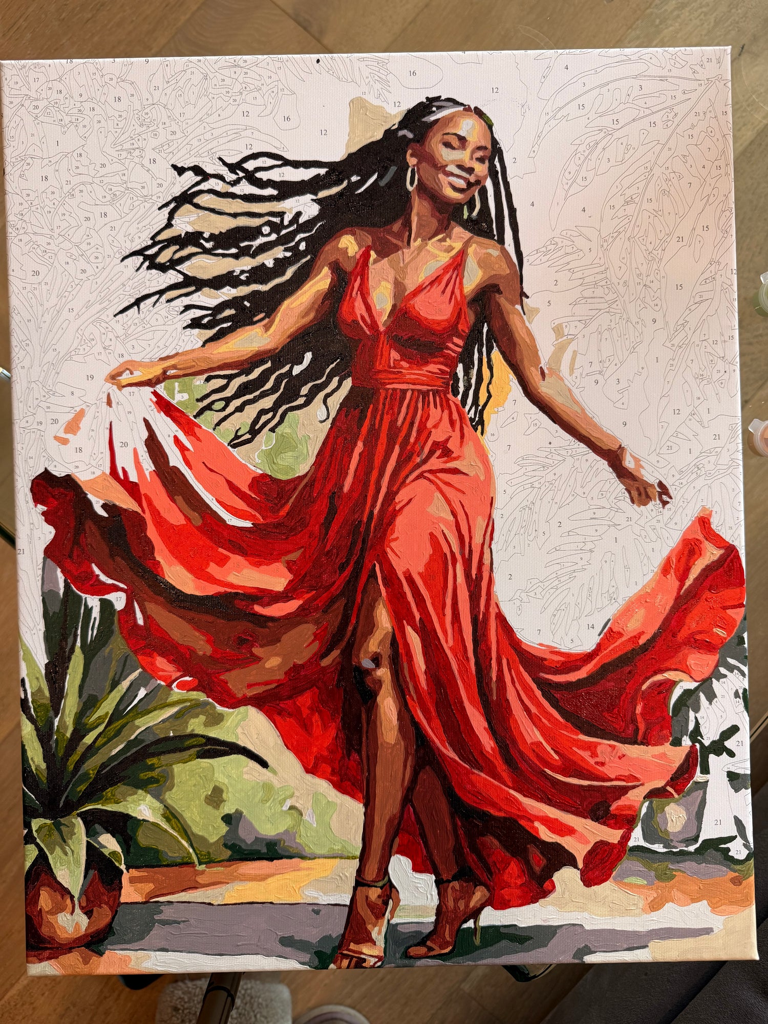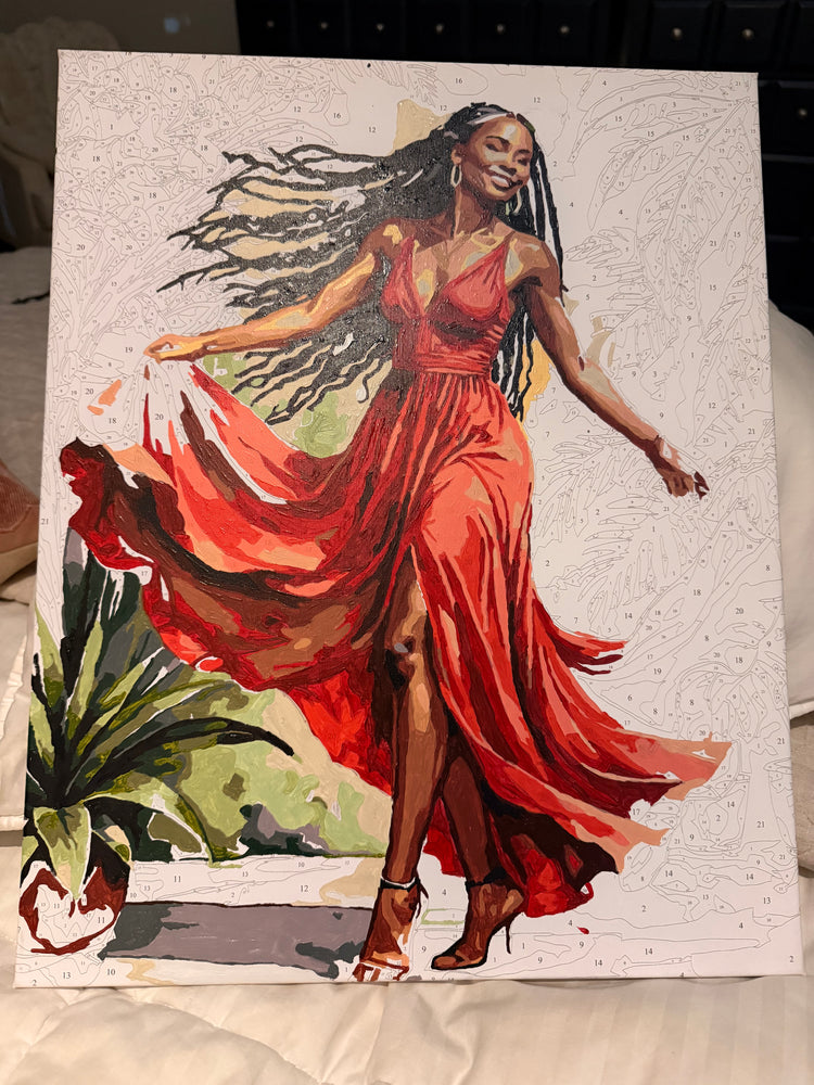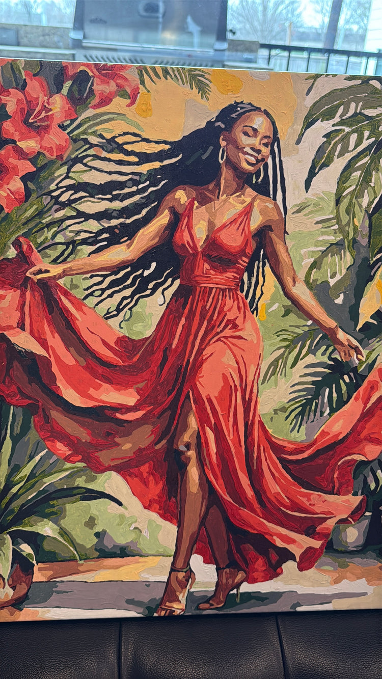 This profound artwork honors the intersection of heritage and jubilee through masterful artistic expression and cultural resonance. If only our ancestors could see us now? They would be elated that their hard work and turmoil resulted in such moments of happiness exhibited by this dancing subject. She expresses a sophisticated glee that is carefree, regal and meaningful. This piece, once completed, is to serve as a bridge between past and present and a reminder that our (relatively) carefree moments were paved by those unknown from the past.